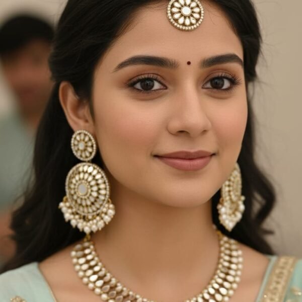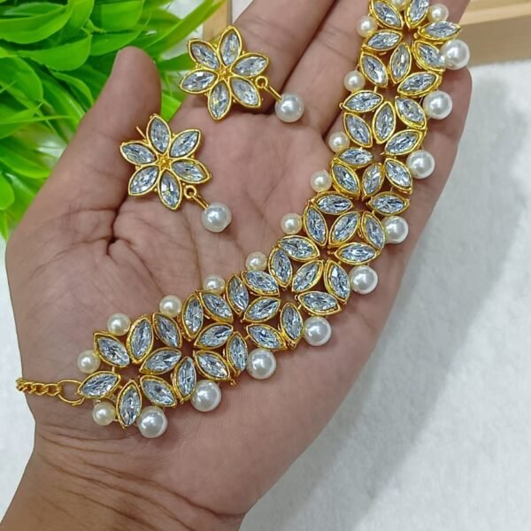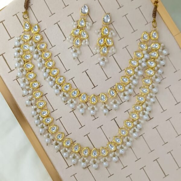 Short Description: Elegant gold-plated choker necklace adorned with teardrop-shaped white kundan/polki stones and clusters of dangling small white pearls. Comes with matching delicate drop earrings featuring pearl accents. A timeless and sophisticated design, ideal for bridal, wedding guest, or traditional ethnic looks.