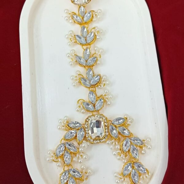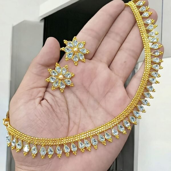 : Elegant gold-plated necklace set featuring teardrop-shaped clear zircon/polki stones surrounded by sparkling American diamonds (AD). The design includes dangling floral pendants for a luxurious touch. Comes with matching drop earrings and a delicate maang tikka. Perfect for bridal, reception, or festive wear—timeless and sophisticated.