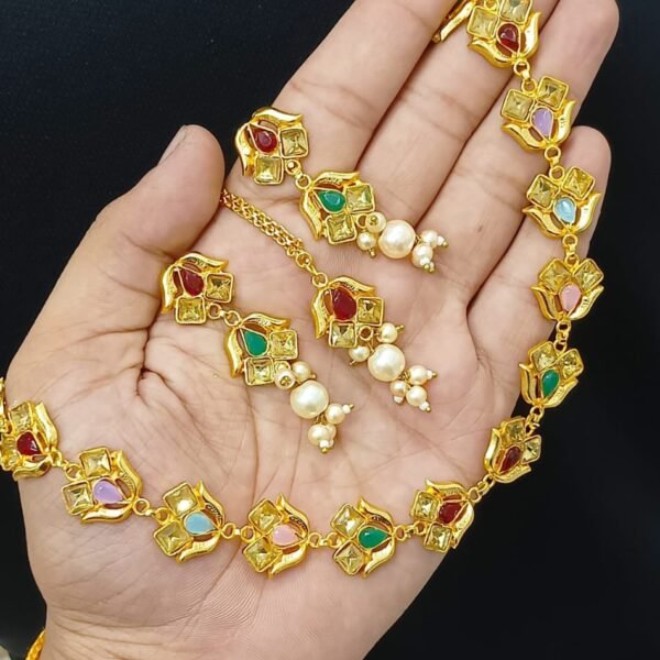 Title: Vibrant Multicolor Navratna Bridal Choker Set with Maang Tikka