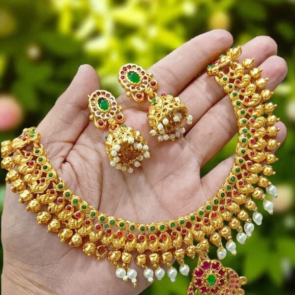 Short Description: Make a bold statement with this breathtaking Temple-style jewelry set. The necklace features intricately crafted gold-plated elephant motifs, symbolizing royalty and grace. It is beautifully accented with ruby red and emerald green stones, finished with a lush fringe of delicate pearl clusters for a classic Guttapusalu look.