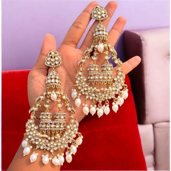 Short Description: Statement oversized jhumka earrings featuring teardrop tops with ruby red and emerald green accents, intricate gold filigree, and vibrant multicolored dangling beads (pink, purple, yellow, green, blue). Paired with multi-strand white pearl ear chains (sahara) for added drama. A bold, festive design perfect for bridal looks, weddings, receptions, or traditional celebrations.
