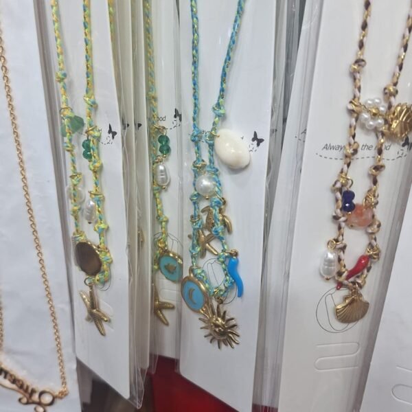 এই বোহো স্টাইলের নেকলেসটি নীল-সবুজ কর্ড দিয়ে তৈরি, যাতে গোল্ডেন থ্রেড মিশিয়ে একটি আকর্ষণীয় লুক দেওয়া হয়েছে। নেকলেসে বিভিন্ন সুন্দর চার্ম ঝুলানো – পার্ল, সি শেল, স্টারফিশ, টার্টল, ব্লু এনামেল মুন, টারকোয়াইজ চিলি পেপার এবং সান ফেস চার্ম। সমুদ্রের থিমের এই জুয়েলারিটি গ্রীষ্মকালীন বা ক্যাজুয়াল আউটফিটের সাথে পরার জন্য আদর্শ, যা একটি ফ্রেশ ও প্লেফুল ভাইব দেয়। লাইটওয়েট এবং আরামদায়ক, উপহার হিসেবেও পারফেক্ট!