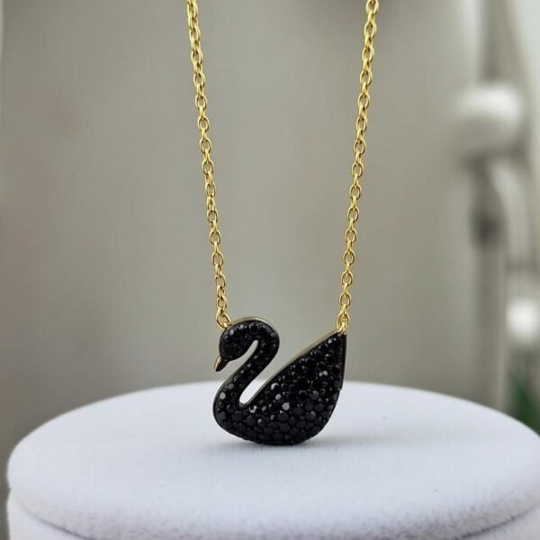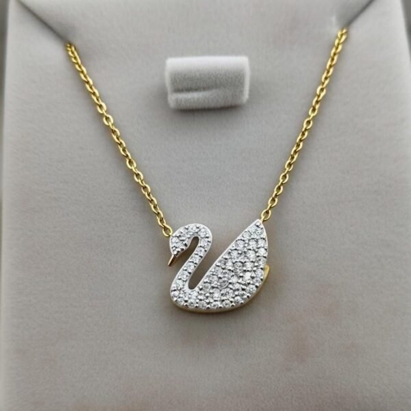 এই সুন্দর নেকলেসটিতে একটি মার্জিত রাজহাঁস আকৃতির পেন্ডেন্ট রয়েছে, যা গোল্ড টোনের চেইনে ঝুলানো। পেন্ডেন্টের শরীরের অংশটি ঝকঝকে ক্লিয়ার ক্রিস্টাল দিয়ে পেভে সেট করা, যা আলো পড়লে অসাধারণ চকচক করে। beak অংশটি গোল্ডেন, যা একটি ক্লাসিক ও পরিশীলিত চেহারা দেয়। এই জুয়েলারিটি যেকোনো পোশাকের সাথে পরে আরও আকর্ষণীয় লুক পাওয়া যাবে – নিজের জন্য বা উপহার হিসেবে আদর্শ!
