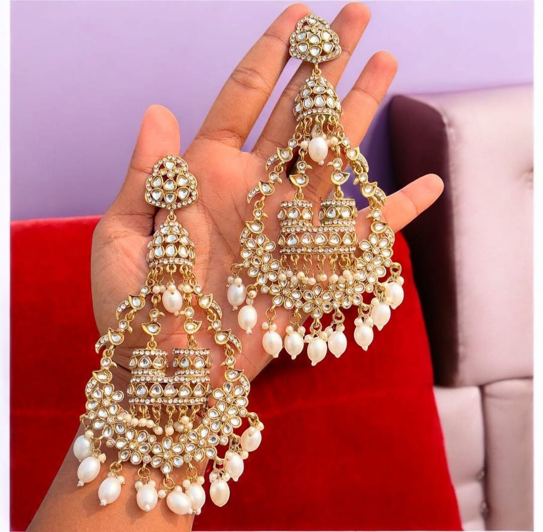 সংক্ষিপ্ত বিবরণ: অপূর্ব গোল্ড-প্লেটেড কুন্দন চোকার সেট, টিয়া-আকৃতির পলকি স্টোন ও ঝুলন্ত মুক্তোর গুচ্ছ দিয়ে সজ্জিত। সেটে রয়েছে ম্যাচিং ছোট দুল, তিন লেয়ারের পার্ল সাহারা (ইয়ার চেইন), কুন্দন নোজ রিং এবং মাঙ্গটিকা (টিকলি)। সম্পূর্ণ ব্রাইডাল বা বিশেষ অনুষ্ঠানের জন্য মার্জিত ও বিলাসবহুল লুক।
