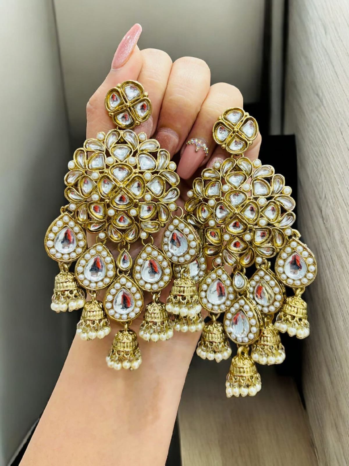 সংক্ষিপ্ত বিবরণ: বিলাসবহুল গোল্ড-প্লেটেড কুন্দন ঝুমকা দুল, পাচ্চি স্টাইলে তৈরি। অসংখ্য আনকাট কুন্দন, মুক্তোর লাইন এবং নবরত্ন রঙের স্টোন (নীল, বেগুনি, লাল, হলুদ, গোলাপি ইত্যাদি) দিয়ে সজ্জিত। নিচে ঝুলন্ত ছোট ছোট ঘণ্টা ও রঙিন পুঁতির গুচ্ছ। বিয়ে, রিসেপশন বা উৎসবের জন্য আকর্ষণীয় ঐতিহ্যবাহী গয়না।