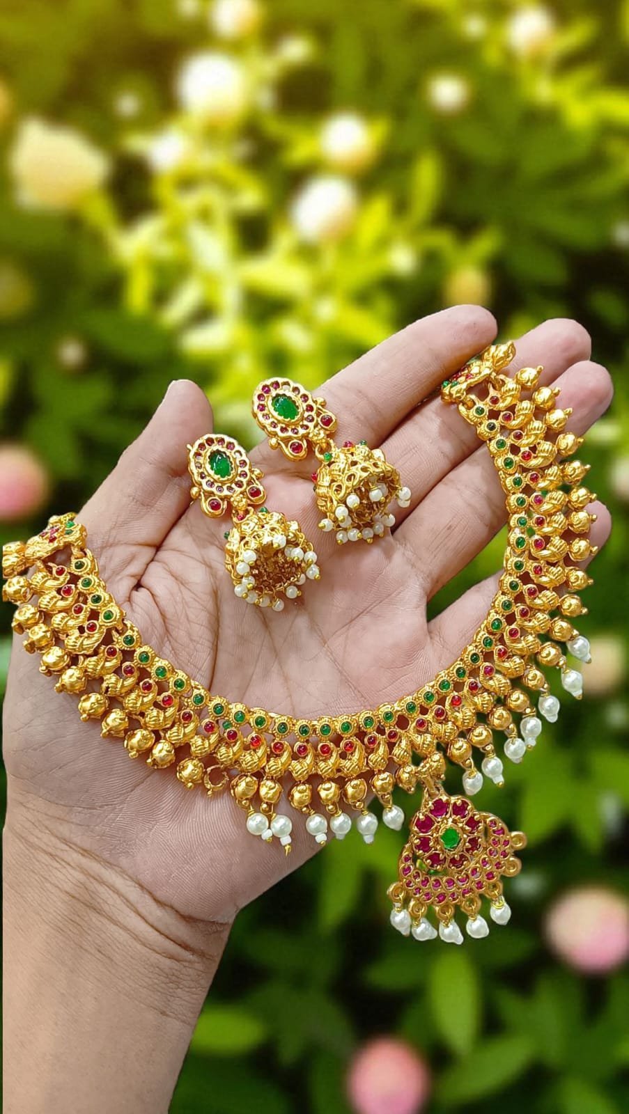 এই রাজকীয় নেকলেস সেটটি গোল্ড টোনের তৈরি, যাতে বড় বড় রুবি (লাল স্টোন) এবং সবুজ এমেরাল্ড স্টোনের সাথে ঝকঝকে হোয়াইট স্টোন সেট করা। নেকলেসের ডিজাইনে ছোট ছোট গোল্ডেন বল এবং রিংয়ের প্যাটার্ন যোগ করা হয়েছে, যা ঐতিহ্যবাহী ভারতীয় স্টাইলের একটি অসাধারণ উদাহরণ। ম্যাচিং ইয়াররিংস সহ এই সেটটি সাড়ি বা এথনিক পোশাকের সাথে পরলে রয়্যাল লুক দেবে। বিবাহ, রিসেপশন বা বিশেষ উৎসবে পরার জন্য আদর্শ – টেকসই এবং চকচকে, উপহার হিসেবেও দারুণ!