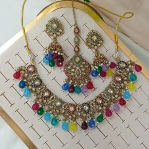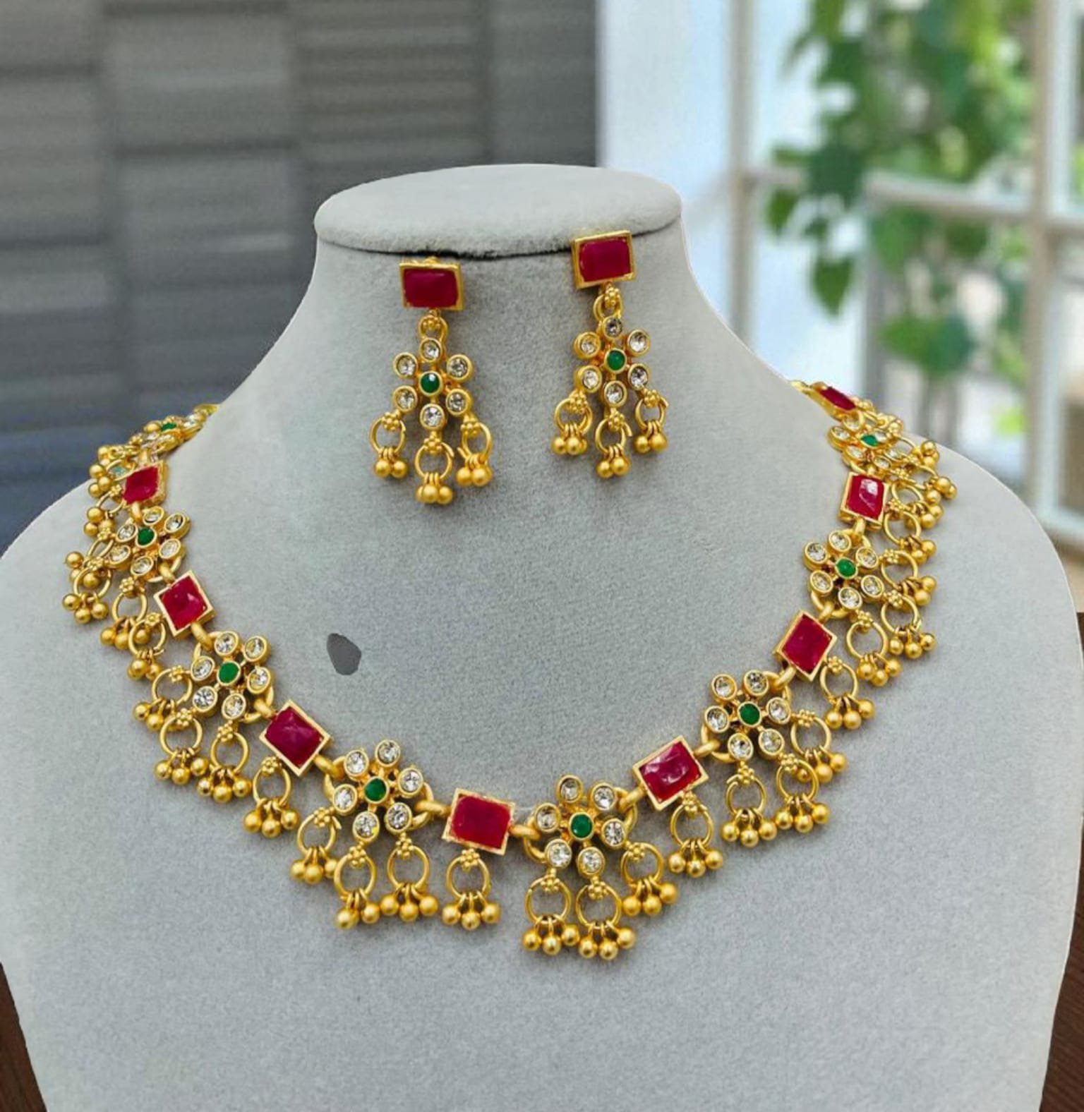 এই রাজকীয় নেকলেস সেটটি গোল্ড টোনের তৈরি, যাতে বড় বড় রুবি (লাল স্টোন) এবং সবুজ এমেরাল্ড স্টোনের সাথে ঝকঝকে হোয়াইট স্টোন সেট করা। নেকলেসের ডিজাইনে ছোট ছোট গোল্ডেন বল এবং রিংয়ের প্যাটার্ন যোগ করা হয়েছে, যা ঐতিহ্যবাহী ভারতীয় স্টাইলের একটি অসাধারণ উদাহরণ। ম্যাচিং ইয়াররিংস সহ এই সেটটি সাড়ি বা এথনিক পোশাকের সাথে পরলে রয়্যাল লুক দেবে। বিবাহ, রিসেপশন বা বিশেষ উৎসবে পরার জন্য আদর্শ – টেকসই এবং চকচকে, উপহার হিসেবেও দারুণ!