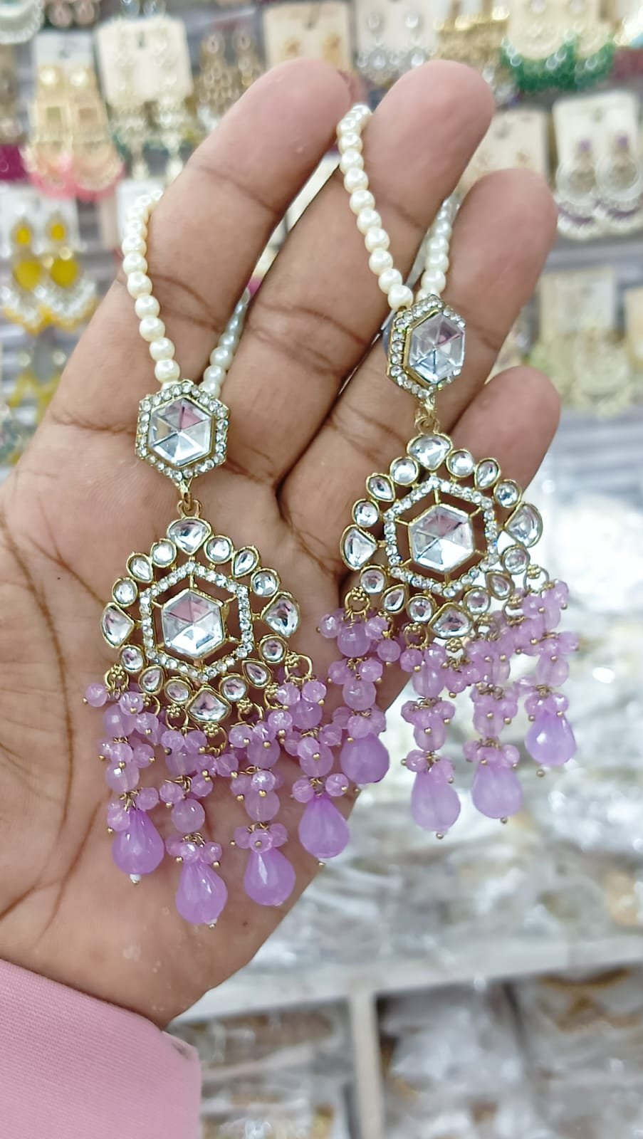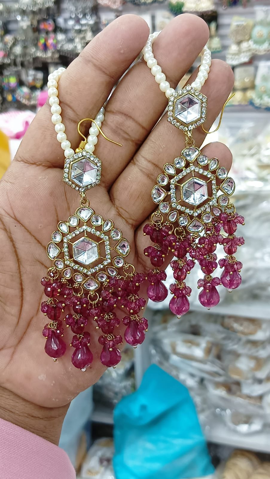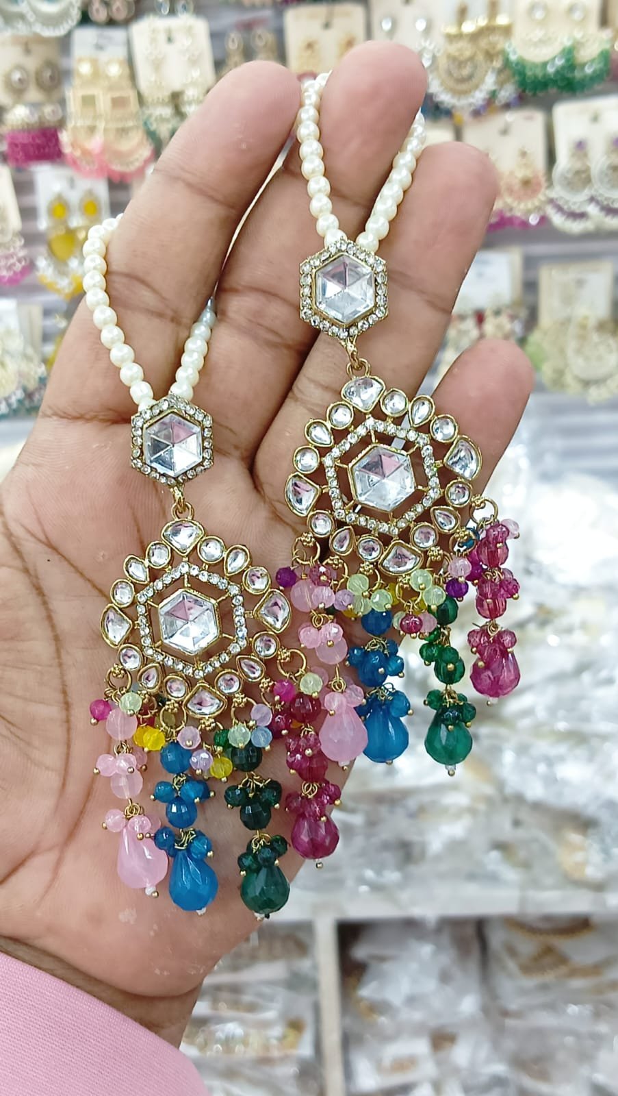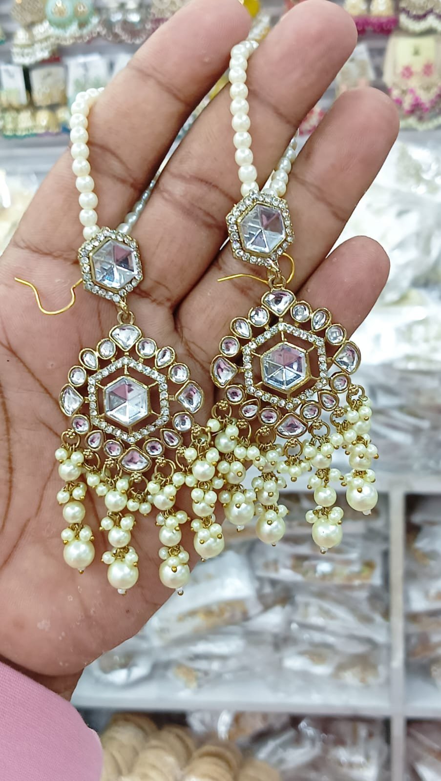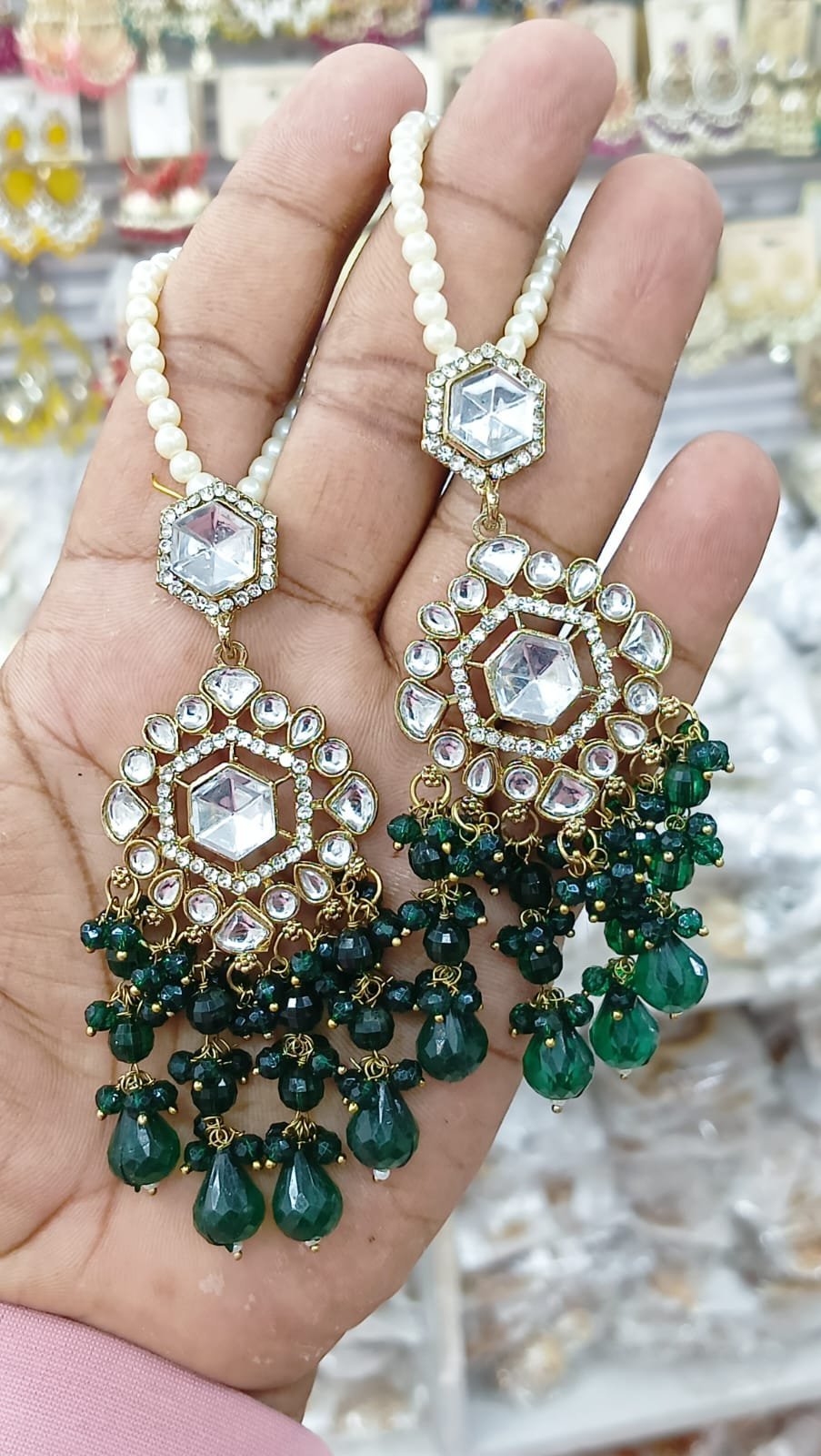সংক্ষিপ্ত বিবরণ: অসাধারণ গোল্ড-প্লেটেড পলকি কুন্দন চাঁদবালি দুল, হেক্সাগোনাল ও ফ্লোরাল ডিজাইনের সাথে বড় বড় আনকাট কুন্দন এবং আমেরিকান ডায়মন্ডের কাজ। নিচে ঝুলন্ত গাঢ় সবুজ ক্রিস্টাল/এমেরাল্ড পুঁতির ঘন গুচ্ছ এবং মুক্তোর ইয়ার চেইন সহ। বিয়ে, রিসেপশন বা ভারী ঐতিহ্যবাহী পোশাকের জন্য অত্যন্ত আকর্ষণীয় গয়না।