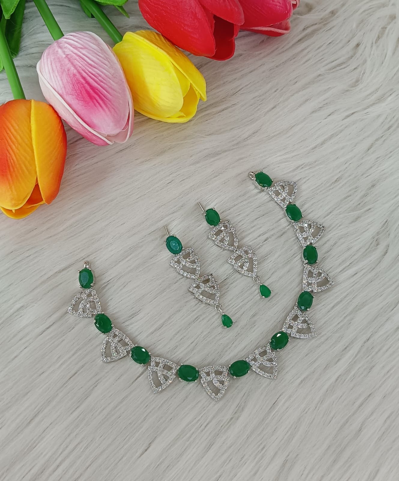 American Diamond or Cubic Zirconia studded necklace set featuring a silver-plated finish