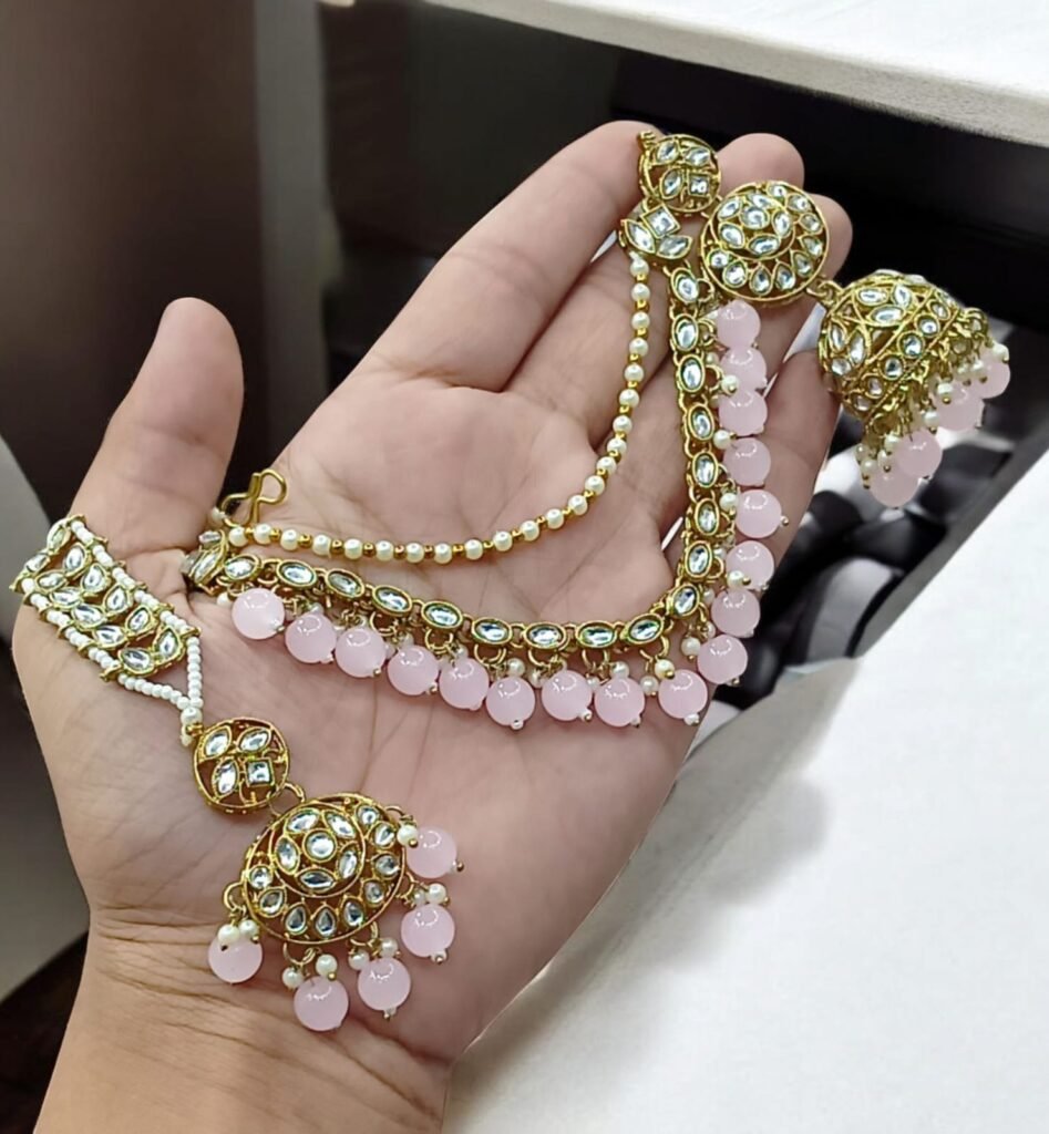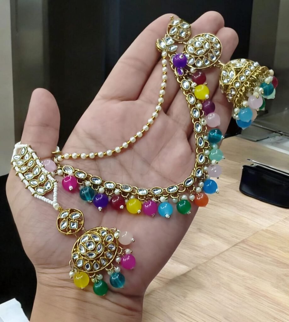 এই রাজকীয় নেকলেস সেটটি গোল্ড টোনের তৈরি, যাতে বড় বড় রুবি (লাল স্টোন) এবং সবুজ এমেরাল্ড স্টোনের সাথে ঝকঝকে হোয়াইট স্টোন সেট করা। নেকলেসের ডিজাইনে ছোট ছোট গোল্ডেন বল এবং রিংয়ের প্যাটার্ন যোগ করা হয়েছে, যা ঐতিহ্যবাহী ভারতীয় স্টাইলের একটি অসাধারণ উদাহরণ। ম্যাচিং ইয়াররিংস সহ এই সেটটি সাড়ি বা এথনিক পোশাকের সাথে পরলে রয়্যাল লুক দেবে। বিবাহ, রিসেপশন বা বিশেষ উৎসবে পরার জন্য আদর্শ – টেকসই এবং চকচকে, উপহার হিসেবেও দারুণ!