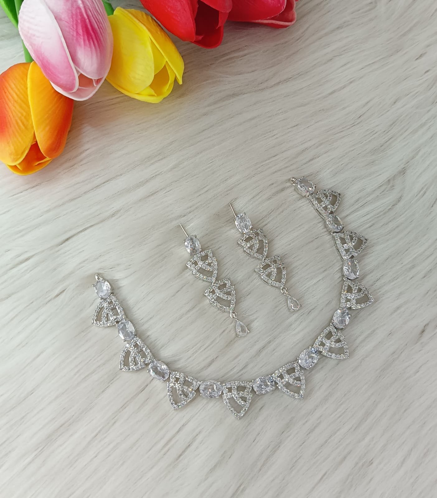 American Diamond or Cubic Zirconia studded necklace set featuring a silver-plated finish.