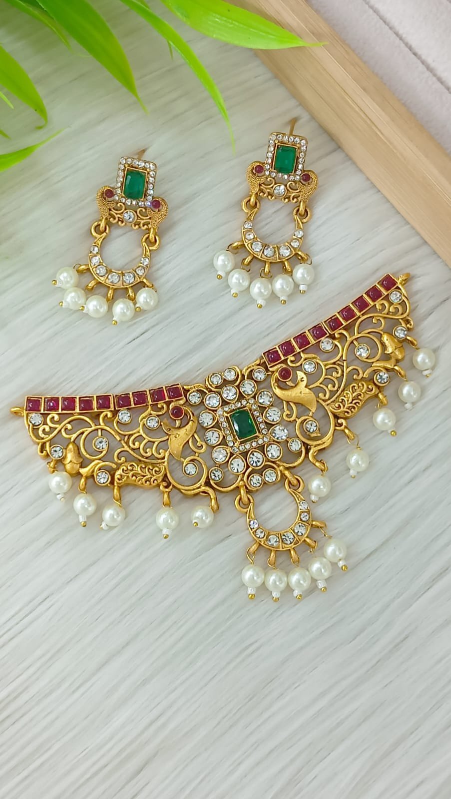 Title:** Antique Gold Peacock Choker Set with Ruby & Emerald Accents