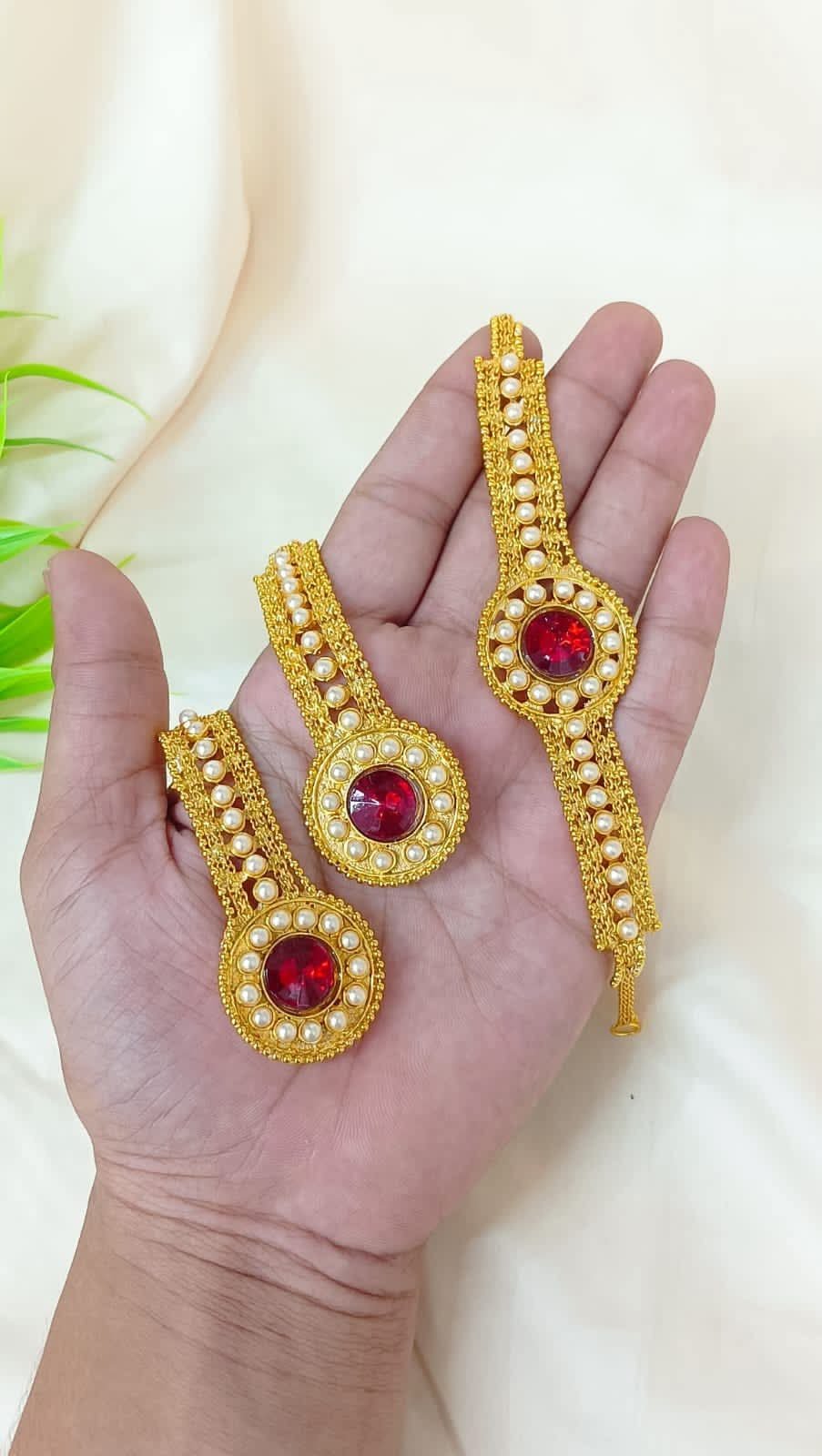 appears to be a traditional gold-plated jewelry set featuring red stones and pearl