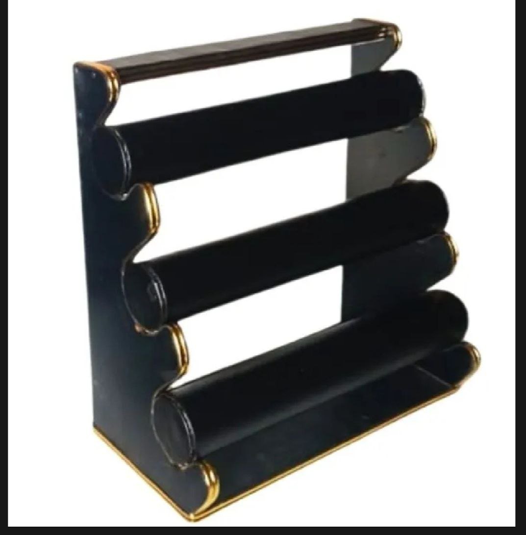 black wooden bangle and bracelet display stand holder with a golden border.