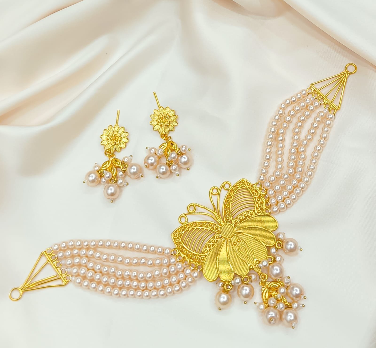 Exquisite multi-strand peach/pink pearl choker featuring a large ornate gold butterfly centerpiece with intricate filigree work and dangling pearl clusters. Comes with matching gold floral jhumka earrings adorned with pearl drops. A romantic and delicate design, perfect for bridal, reception, or traditional ethnic wear.