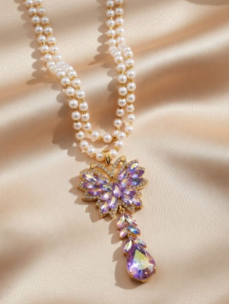 necklace features a trendy double-strand pearl chain