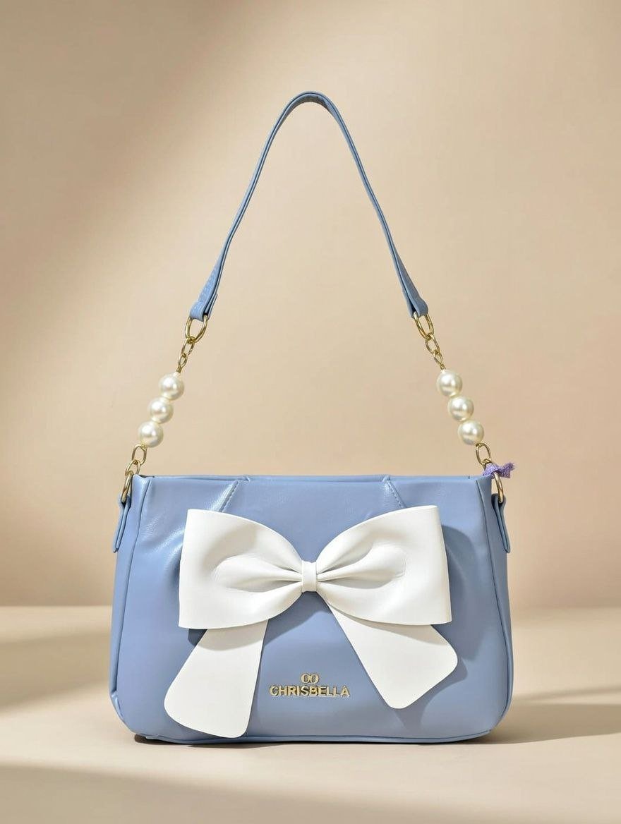 This charming shoulder bag from Chrisbella comes in a soft, dreamy sky blue (pastel light blue) faux leather with a sleek, slightly quilted design. The standout feature is the large, elegant white satin bow prominently placed at the front, adding a sweet and feminine touch. It includes a long adjustable shoulder strap accented with shiny white faux pearls and gold chain links for a luxurious, glamorous vibe, plus gold hardware details and the brand name “CHRISBELLA” embossed in gold at the bottom.