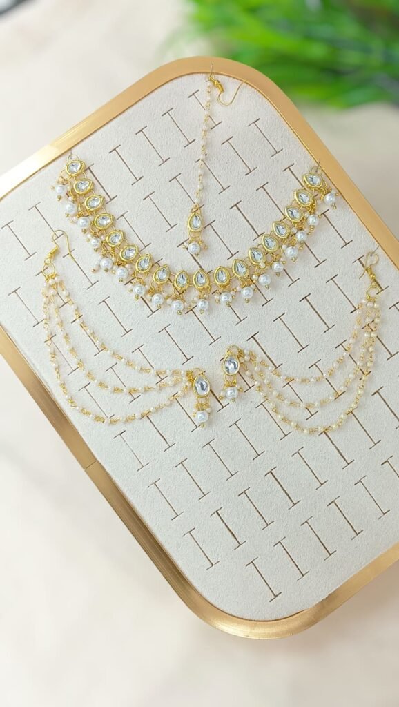 এই সুন্দর পার্ল নেকলেস সেটটিতে সাদা মুক্তোর স্ট্রিং এবং গোল্ডেন কুন্দন পেন্ডেন্টস রয়েছে, যেখানে ক্লিয়ার স্টোন বসানো এবং ছোট ছোট মুক্তো ঝুলানো। নেকলেসের ডিজাইনটি ঐতিহ্যবাহী কিন্তু মার্জিত, ম্যাচিং ইয়াররিংস সহ। কুন্দন ও পার্লের কম্বিনেশন একটি রয়্যাল এবং গ্রেসফুল লুক দেয়, যা সাড়ি, লেহেঙ্গা বা এথনিক পোশাকের সাথে পরার জন্য আদর্শ। বিবাহ, পার্টি বা উৎসবে পরে অসাধারণ দেখাবে – উপহার হিসেবেও দারুণ চয়েস!