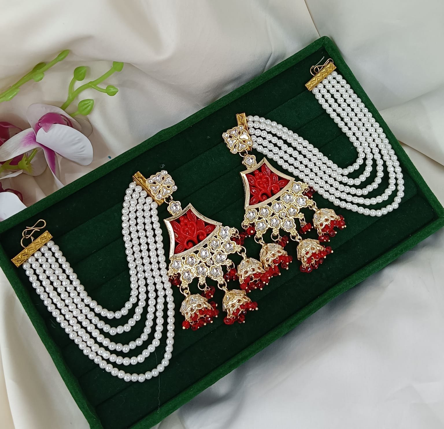 earrings are designed in a traditional Multani style, featuring intricate blue and gold details with multiple rows of white pearls.