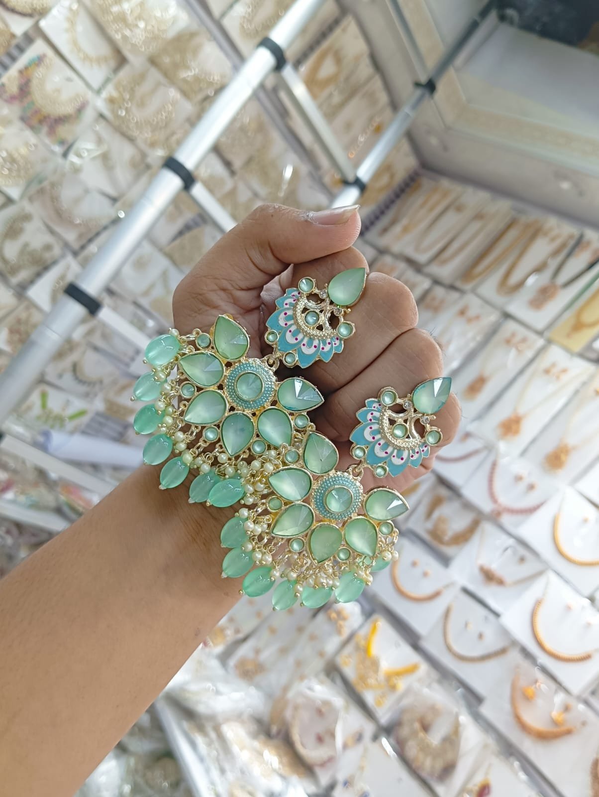সংক্ষিপ্ত বিবরণ: অসাধারণ গোল্ড-প্লেটেড পলকি কুন্দন চাঁদবালি দুল, হেক্সাগোনাল ও ফ্লোরাল ডিজাইনের সাথে বড় বড় আনকাট কুন্দন এবং আমেরিকান ডায়মন্ডের কাজ। নিচে ঝুলন্ত গাঢ় সবুজ ক্রিস্টাল/এমেরাল্ড পুঁতির ঘন গুচ্ছ এবং মুক্তোর ইয়ার চেইন সহ। বিয়ে, রিসেপশন বা ভারী ঐতিহ্যবাহী পোশাকের জন্য অত্যন্ত আকর্ষণীয় গয়না।