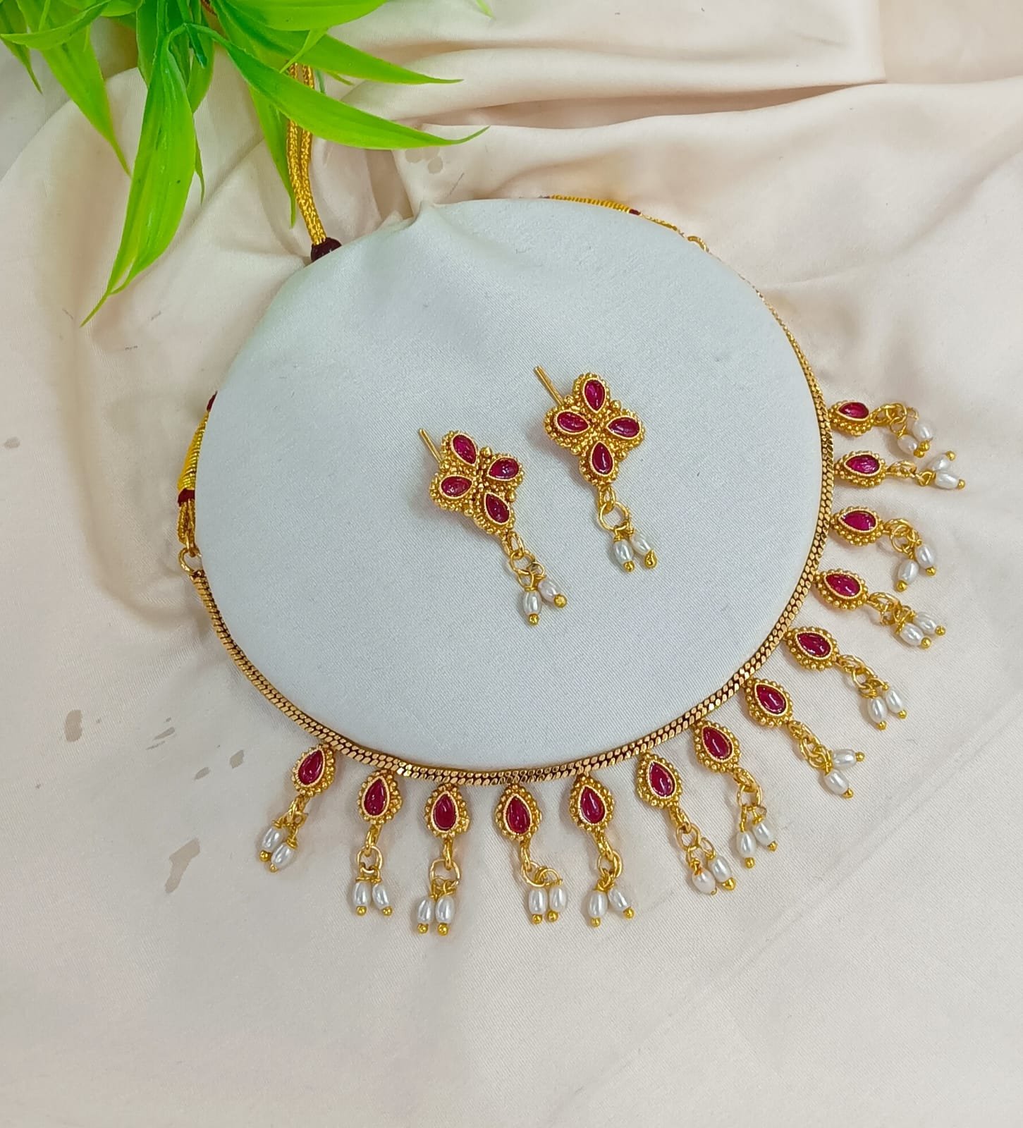 Elegant Ruby Red Stone & Pearl Drop Gold-Plated Necklace Set with Matching Earrings