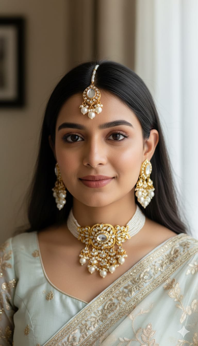 সংক্ষিপ্ত বিবরণ: অসাধারণ গোল্ড-প্লেটেড চোকার নেকলেস, পাপড়ি আকৃতির কুন্দন/আমেরিকান ডায়মন্ডের ফ্লোরাল ডিজাইন এবং ঝুলন্ত ছোট মুক্তোর গুচ্ছ দিয়ে সজ্জিত। ম্যাচিং ফুল-আকৃতির ছোট কানের দুল সহ। মার্জিত ও হালকা ব্রাইডাল/পার্টি লুকের জন্য আদর্শ ঐতিহ্যবাহী গয়না।
