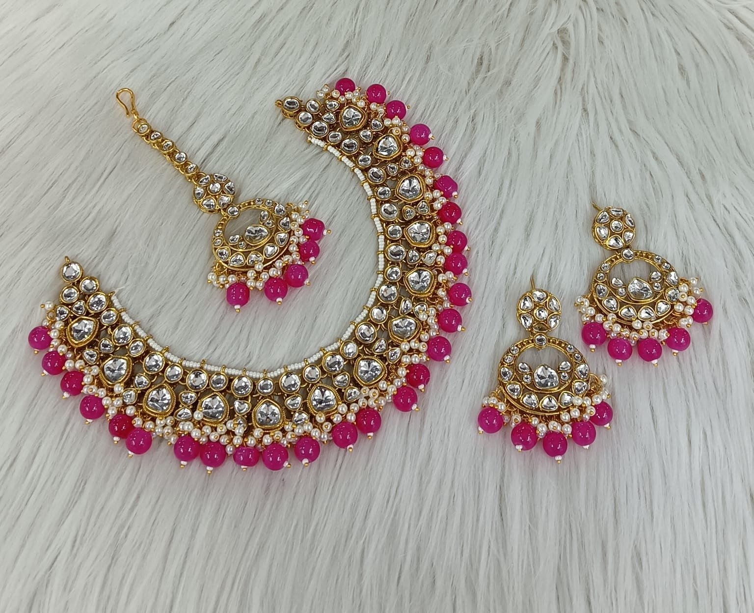 gold-plated Kundan and pearl maroon traditional choker necklace set