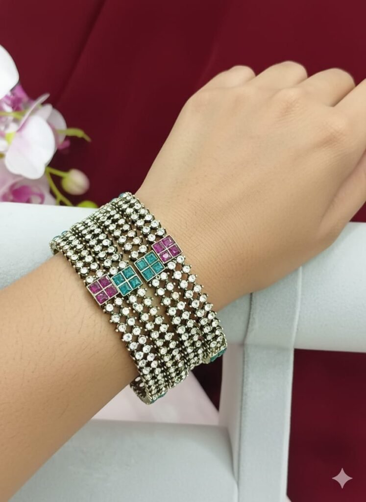 সংক্ষিপ্ত বিবরণ: অপূর্ব ম্যাট গোল্ড ফিনিশের নেকলেস সেট, যাতে ময়ূর ও ফ্লোরাল ডিজাইনের সাথে আমেরিকান ডায়মন্ড (AD), লাল রুবি ও সবুজ এমেরাল্ড স্টোন এবং ঝুলন্ত মুক্তোর কাজ রয়েছে। ম্যাচিং কানের দুল সহ। বিয়ে, রিসেপশন বা বিশেষ অনুষ্ঠানের জন্য আদর্শ ঐতিহ্যবাহী গয়না।