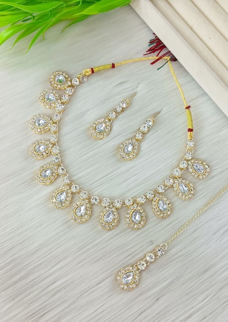 Teardrop Zircon Polki Necklace Set with Maang Tikka