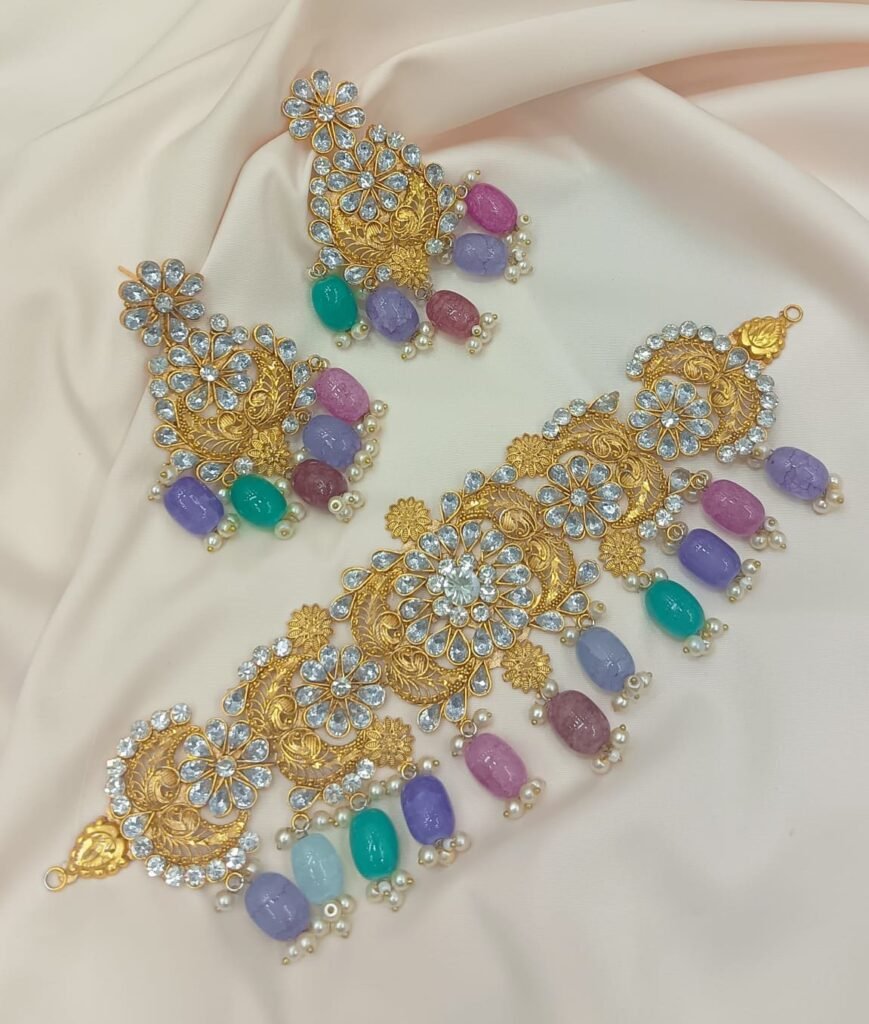 Short Description: Luxurious gold-plated choker necklace featuring intricate filigree work, sparkling American diamonds (AD)/kundan in floral patterns, and dangling pastel multicolored beads (pink, purple, green, blue) with tiny pearl accents. Paired with matching oversized chandbali earrings. A vibrant and regal design, perfect for bridal wear, receptions, or festive ethnic outfits.