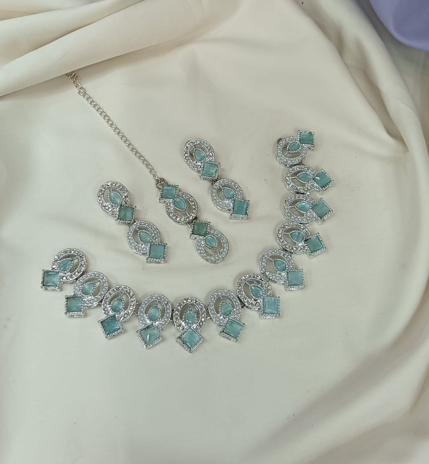 gold-plated necklace set, which includes a necklace, earrings, and a maang tikka, is a traditional design often associated with South Asian bridal or festive wear.