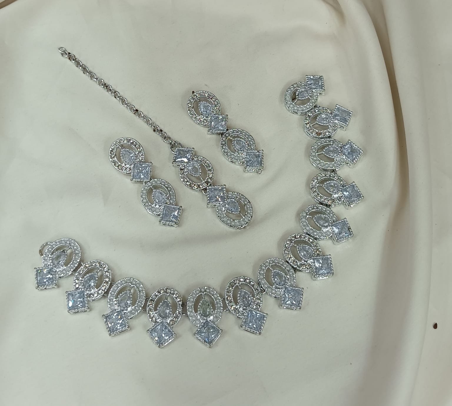 gold-plated necklace set, which includes a necklace, earrings, and a maang tikka, is a traditional design often associated with South Asian bridal or festive wear.
