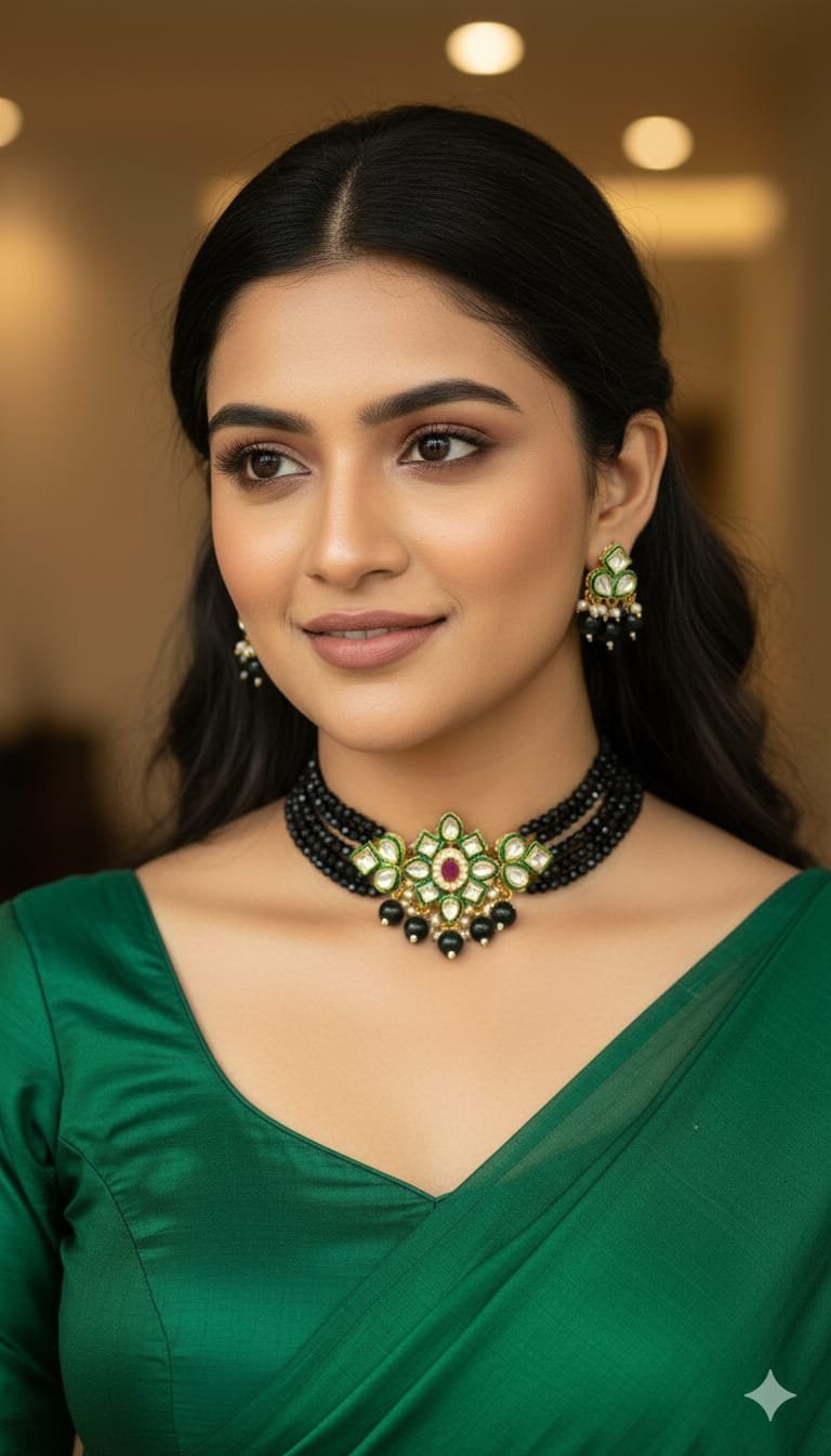 এই রাজকীয় নেকলেস সেটটি গোল্ড টোনের তৈরি, যাতে বড় বড় রুবি (লাল স্টোন) এবং সবুজ এমেরাল্ড স্টোনের সাথে ঝকঝকে হোয়াইট স্টোন সেট করা। নেকলেসের ডিজাইনে ছোট ছোট গোল্ডেন বল এবং রিংয়ের প্যাটার্ন যোগ করা হয়েছে, যা ঐতিহ্যবাহী ভারতীয় স্টাইলের একটি অসাধারণ উদাহরণ। ম্যাচিং ইয়াররিংস সহ এই সেটটি সাড়ি বা এথনিক পোশাকের সাথে পরলে রয়্যাল লুক দেবে। বিবাহ, রিসেপশন বা বিশেষ উৎসবে পরার জন্য আদর্শ – টেকসই এবং চকচকে, উপহার হিসেবেও দারুণ!