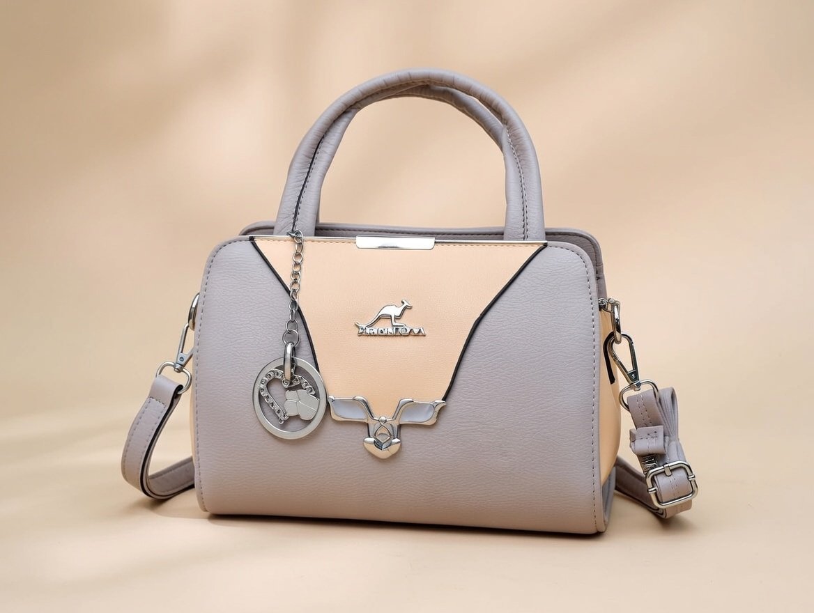 Kangaroo” brand two-tone (grey and beige) faux leather satchel handbag with a removable shoulder strap.