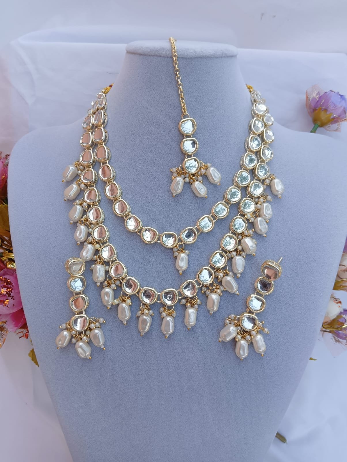 Title: Multi-Layer Mirror Kundan Pearl Necklace Set with Maang Tikka