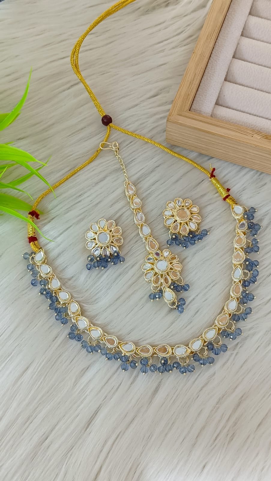 ndian-style antique Kundan jewellery set includes a necklace, earrings, and a maang tikka
