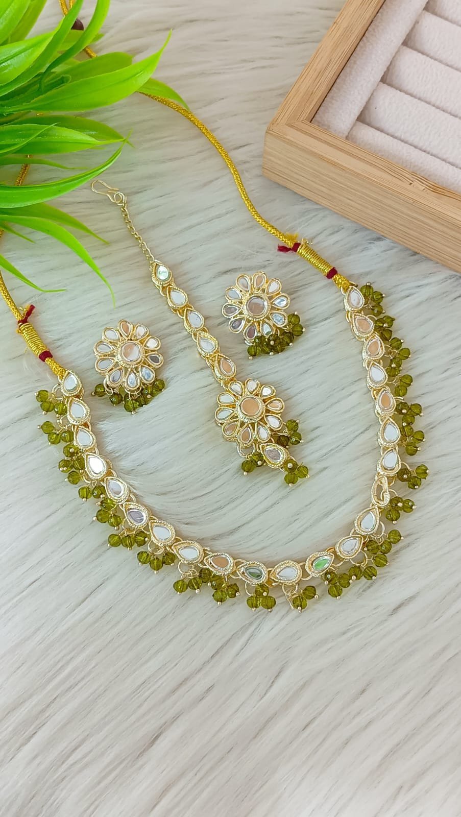 ndian-style antique Kundan jewellery set includes a necklace, earrings, and a maang tikka