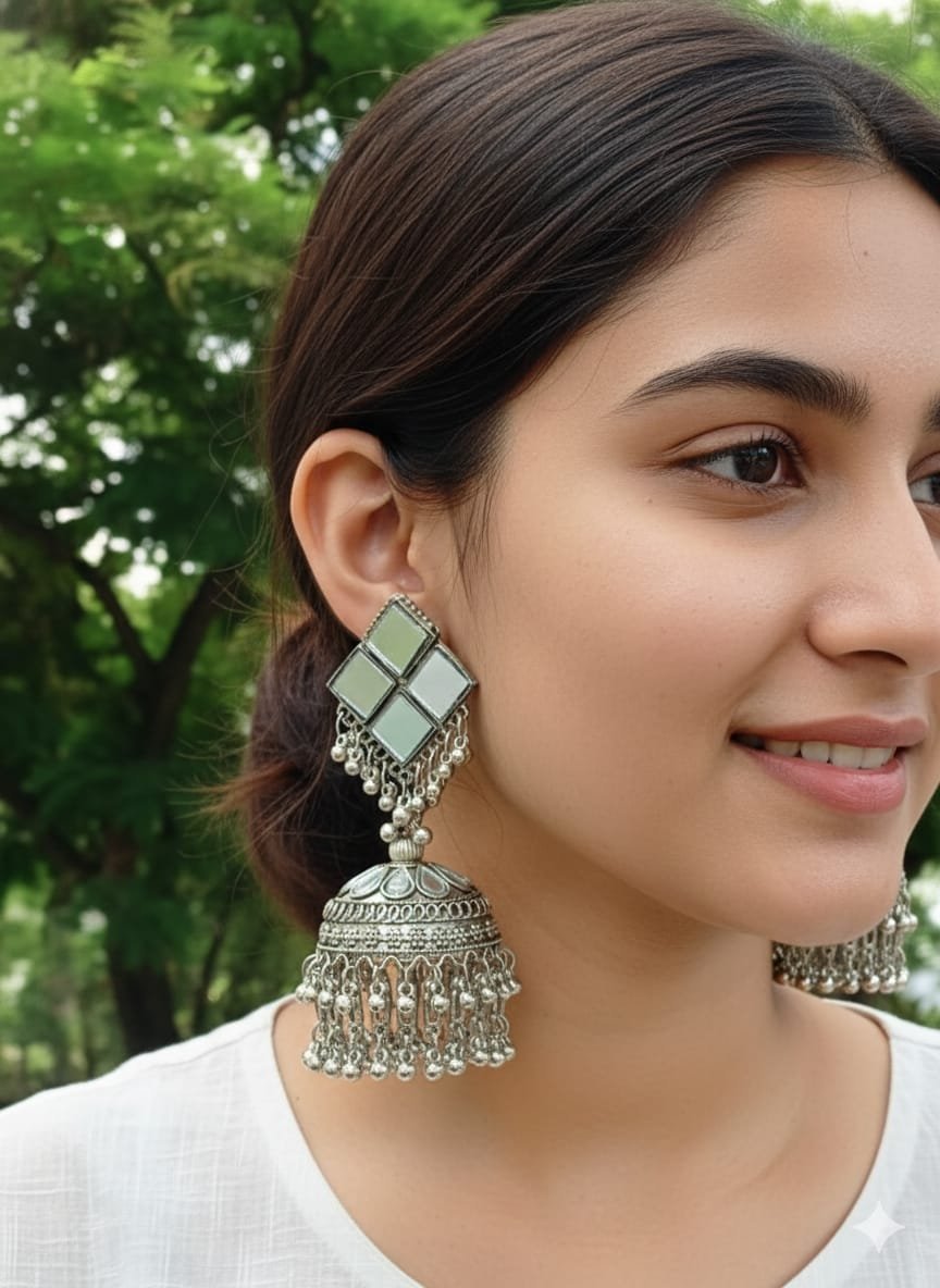 Short Description: Statement oxidized silver-tone long jhumka earrings featuring a floral mirror-work (sheesha) stud top with clear stone accents, connected to an intricately engraved dome and cascading chains adorned with tiny ghungroo bells and leaf charms. A dramatic bohemian-ethnic design that adds vintage charm—perfect for traditional outfits, fusion wear, festivals, or everyday bold styling.