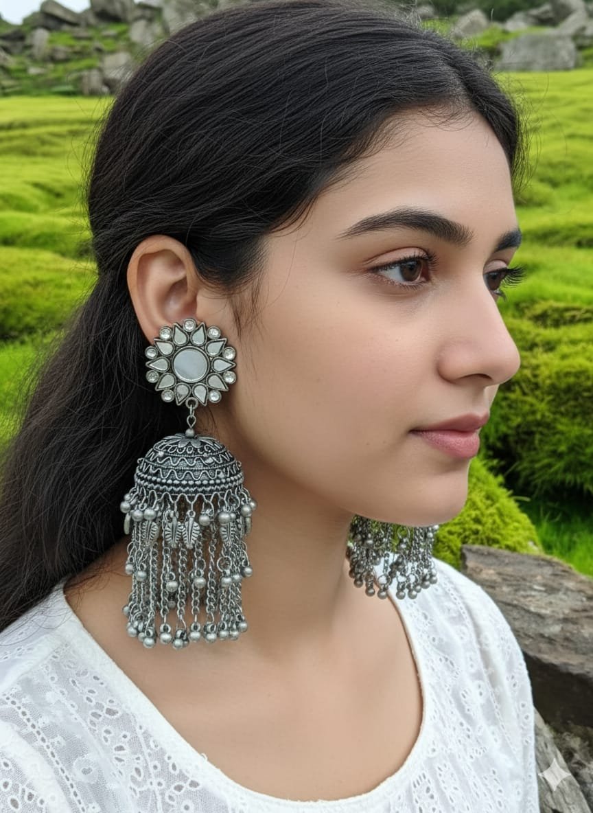 Short Description: Statement oxidized silver-tone long jhumka earrings featuring a floral mirror-work (sheesha) stud top with clear stone accents, connected to an intricately engraved dome and cascading chains adorned with tiny ghungroo bells and leaf charms. A dramatic bohemian-ethnic design that adds vintage charm—perfect for traditional outfits, fusion wear, festivals, or everyday bold styling.