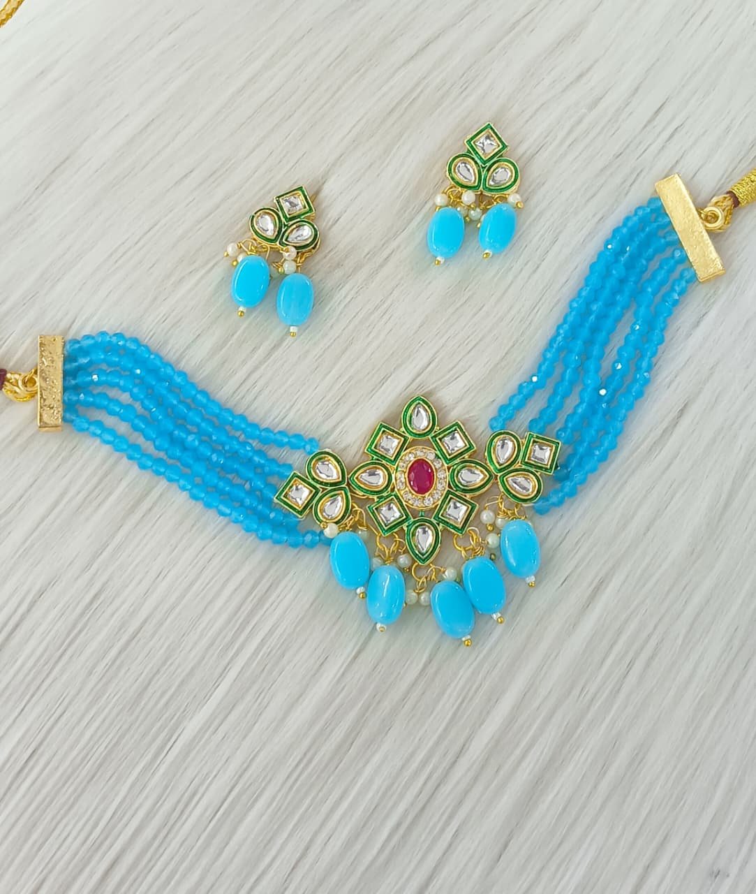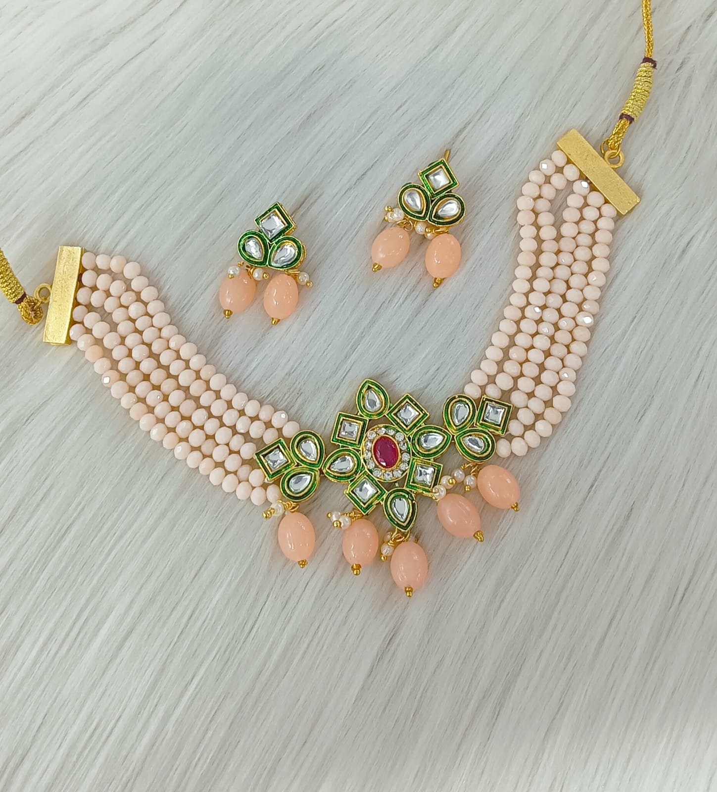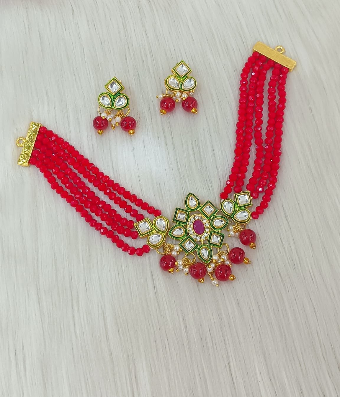 Title: Red Crystal Beaded Choker Set with Kundan Pendant