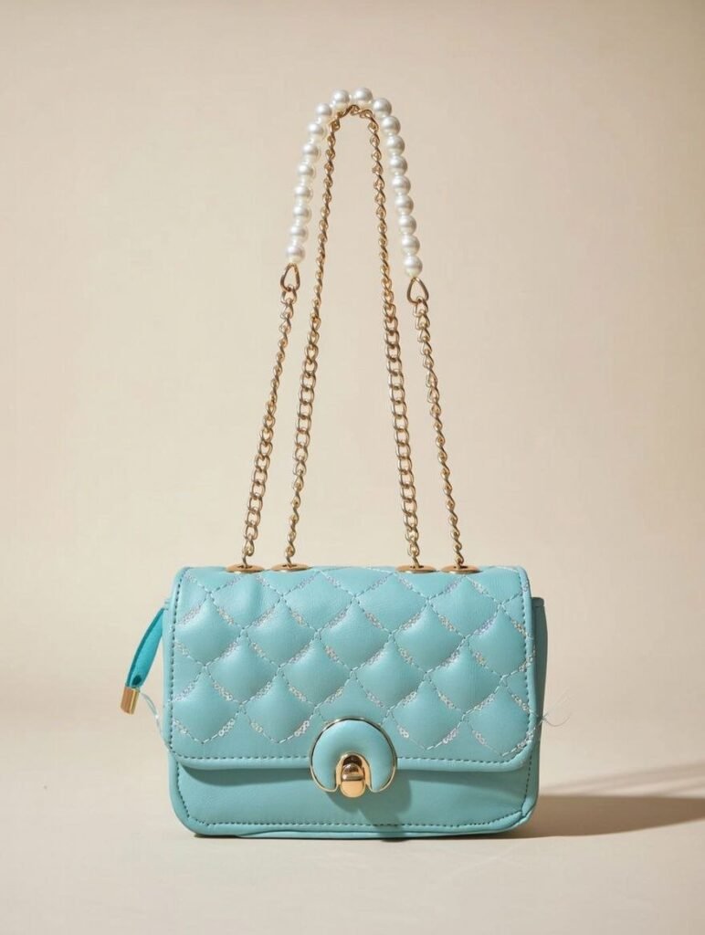This adorable mini flap shoulder bag comes in a fresh, vibrant turquoise color with classic quilted stitching and subtle silver glitter accents along the diamond patterns for a sparkling touch. It features a signature gold turn-lock closure at the front and a luxurious double-strand chain strap made of shiny white faux pearls mixed with gold links — giving it an elegant, glamorous vibe.
