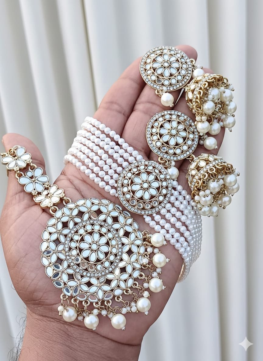 সংক্ষিপ্ত বিবরণ: অপূর্ব গোল্ড-প্লেটেড কুন্দন চোকার সেট, টিয়া-আকৃতির পলকি স্টোন ও ঝুলন্ত মুক্তোর গুচ্ছ দিয়ে সজ্জিত। সেটে রয়েছে ম্যাচিং ছোট দুল, তিন লেয়ারের পার্ল সাহারা (ইয়ার চেইন), কুন্দন নোজ রিং এবং মাঙ্গটিকা (টিকলি)। সম্পূর্ণ ব্রাইডাল বা বিশেষ অনুষ্ঠানের জন্য মার্জিত ও বিলাসবহুল লুক।