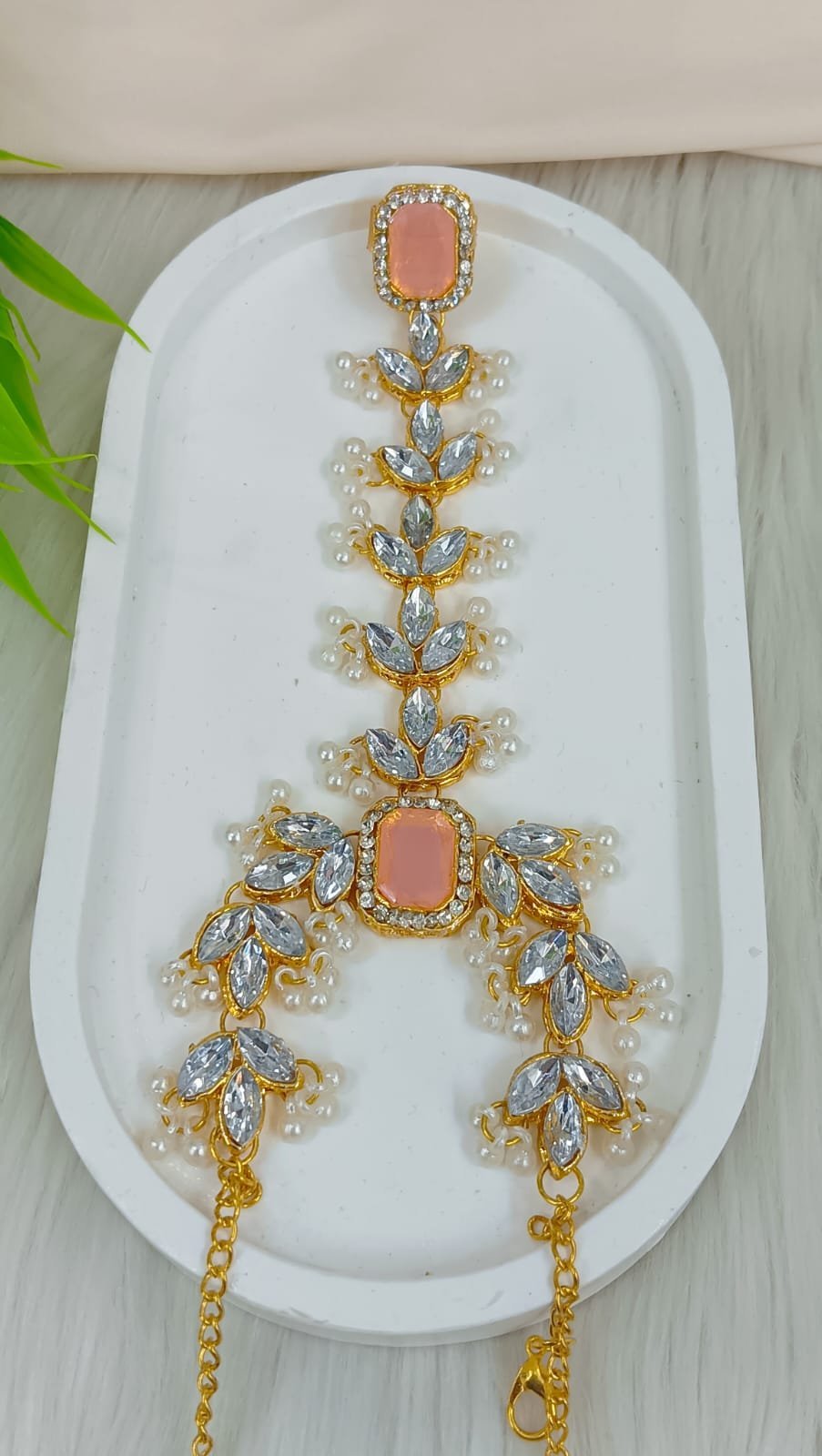 সংক্ষিপ্ত বিবরণ: অপূর্ব ম্যাট গোল্ড ফিনিশের নেকলেস সেট, যাতে ময়ূর ও ফ্লোরাল ডিজাইনের সাথে আমেরিকান ডায়মন্ড (AD), লাল রুবি ও সবুজ এমেরাল্ড স্টোন এবং ঝুলন্ত মুক্তোর কাজ রয়েছে। ম্যাচিং কানের দুল সহ। বিয়ে, রিসেপশন বা বিশেষ অনুষ্ঠানের জন্য আদর্শ ঐতিহ্যবাহী গয়না।