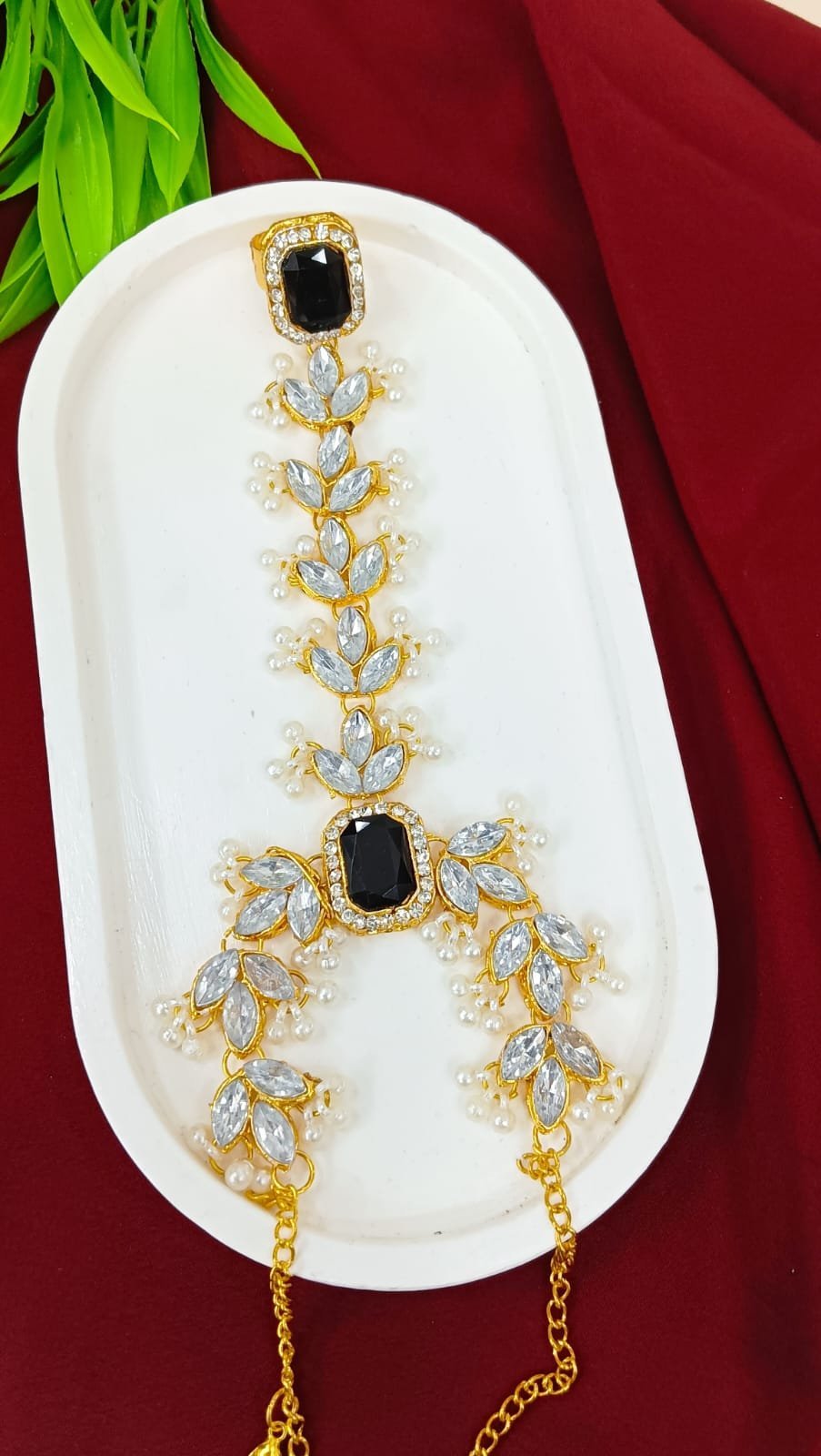 টাইটেল: কুন্দন পলকি ও সবুজ পুঁতি যুক্ত চাঁদবালি ঝুমকা (ইয়ার চেইন সহ)