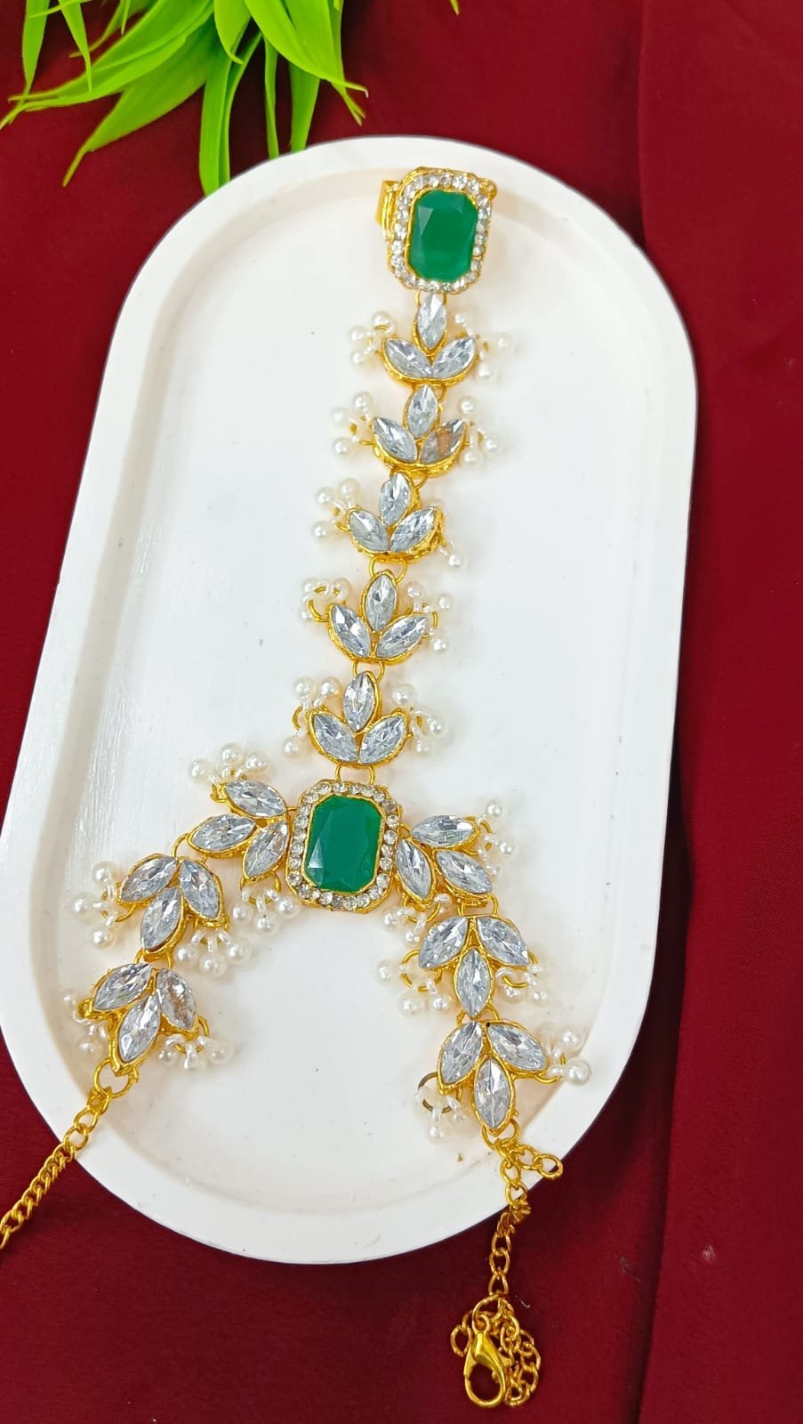 এই সুন্দর পার্ল নেকলেস সেটটিতে সাদা মুক্তোর স্ট্রিং এবং গোল্ডেন কুন্দন পেন্ডেন্টস রয়েছে, যেখানে ক্লিয়ার স্টোন বসানো এবং ছোট ছোট মুক্তো ঝুলানো। নেকলেসের ডিজাইনটি ঐতিহ্যবাহী কিন্তু মার্জিত, ম্যাচিং ইয়াররিংস সহ। কুন্দন ও পার্লের কম্বিনেশন একটি রয়্যাল এবং গ্রেসফুল লুক দেয়, যা সাড়ি, লেহেঙ্গা বা এথনিক পোশাকের সাথে পরার জন্য আদর্শ। বিবাহ, পার্টি বা উৎসবে পরে অসাধারণ দেখাবে – উপহার হিসেবেও দারুণ চয়েস!