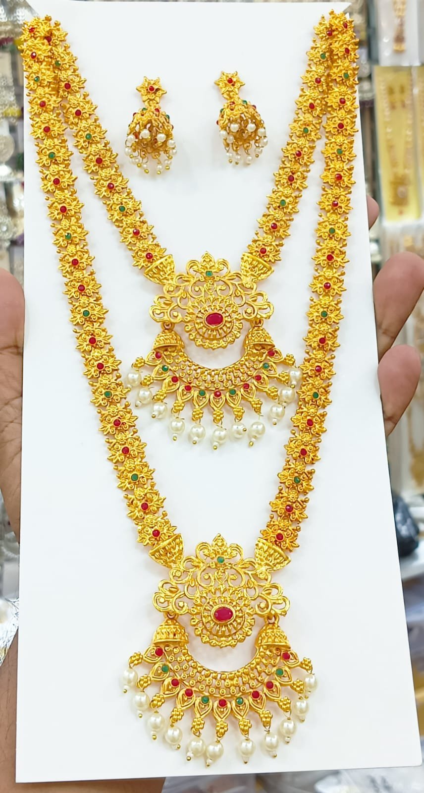 Short Description: Grand matte gold-plated long haram necklace featuring intricate floral and paisley motifs, embellished with ruby red and emerald green stones throughout the chain and ornate layered pendants. Finished with dangling white pearl drops for added elegance. Includes matching jhumka earrings with pearl accents. A classic South Indian bridal design, perfect for weddings, receptions, or grand traditional