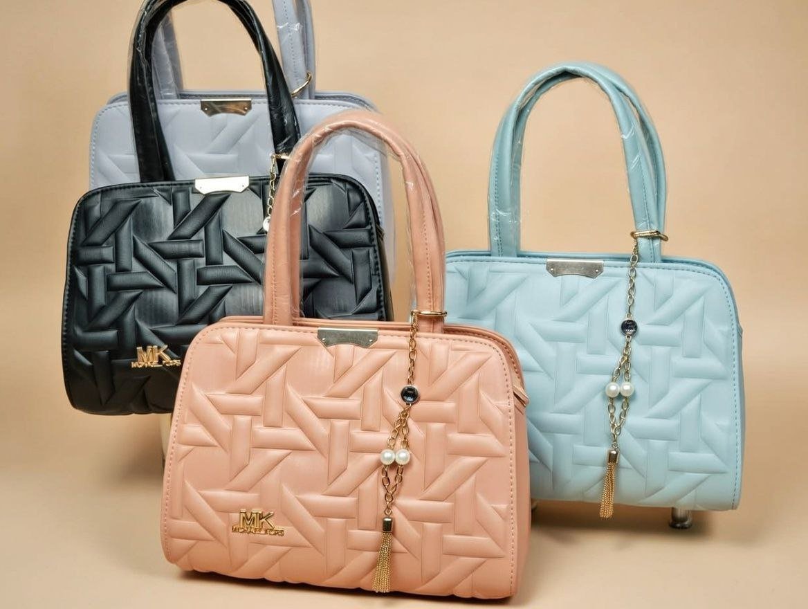 women’s satchel or top-handle handbags, featuring a distinct geometric quilted pattern and a small decorative tassel charm.